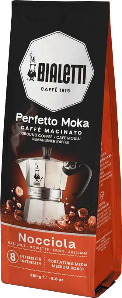 Ínyenc mogyorós aroma pörkölt jegyekkel és kerek, finom ízzel. Egy átfogó ízvilág valódi mogyoró kivonattal és közepes intenzitású pörkölés egyvelege, amelyet a Bialetti fejlesztett ki a kávékeverék aromás tulajdonságainak tökéletesítésére.A tasakot aromazáró szeleppel látták el a kávékverék tökéletes aromájának megőrzése érdekében. A tasak kinyitása után hűvös és száraz helyen, hő- és páratartalomtól távol tartandó.
