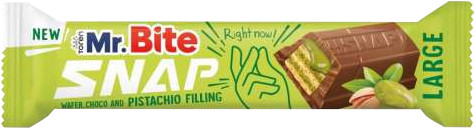 Tejcsokoládéval bevont ostya pisztácia töltelékkel.