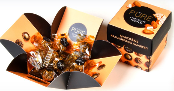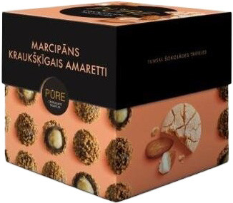 Marcipános krémmel töltött étcsokoládé trüffel amaretti keksz darabokkal szórva.