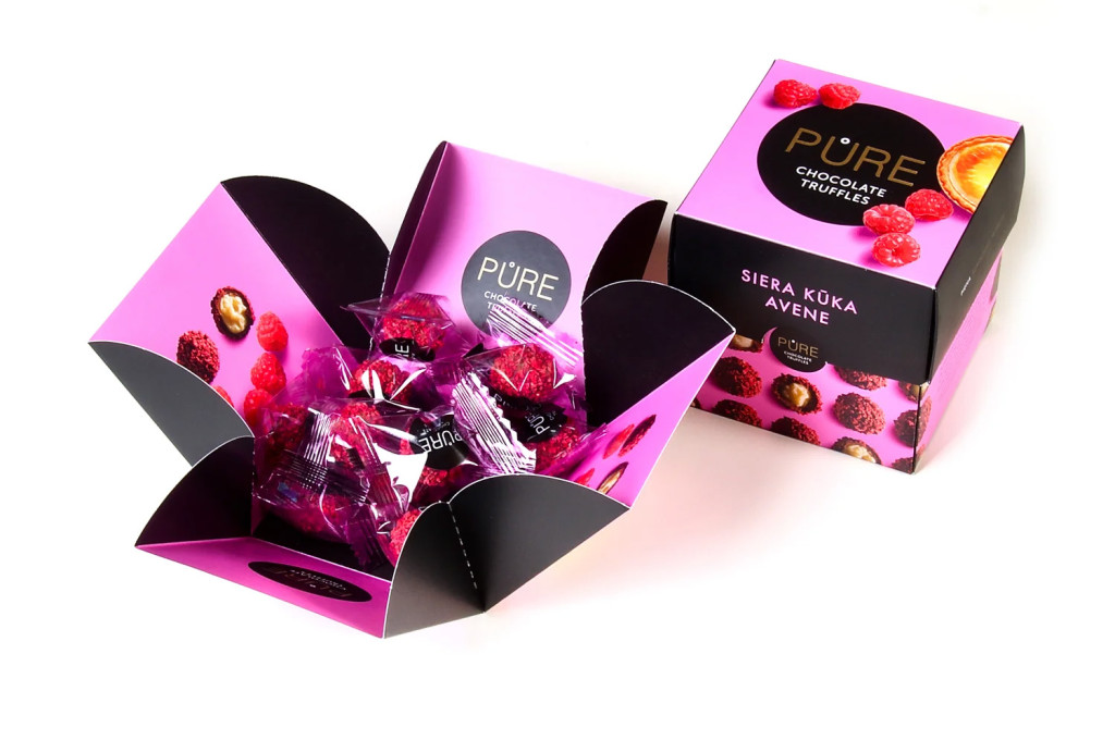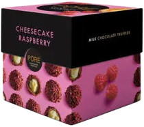 Sajtortás trüffelkrémmel töltött tejcsokoládé málnás szórással.