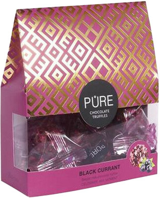 Tejcsokoládé feketeribizlis trüffelkrémmel töltve.