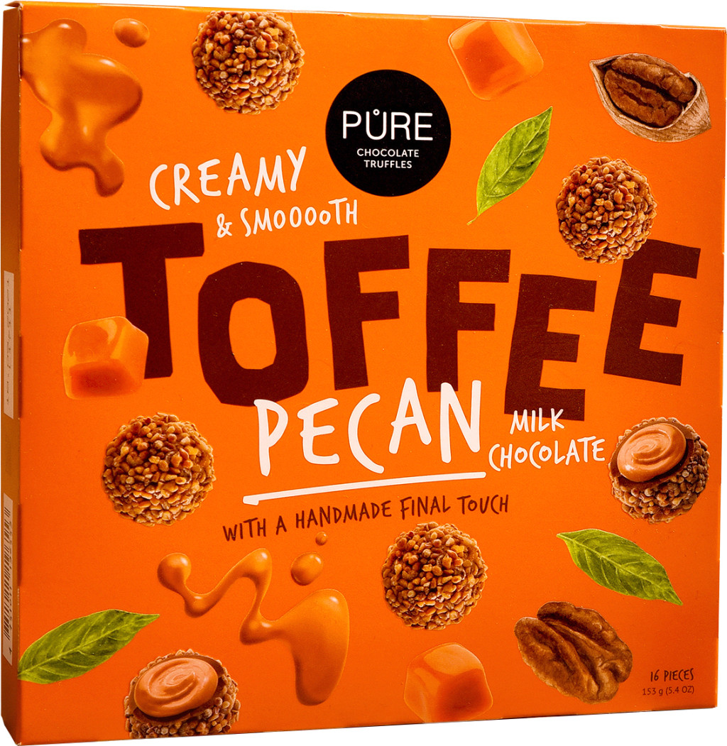 Toffee - csokoládé trüffel karamell töltelékkel és pekándióval borítva.