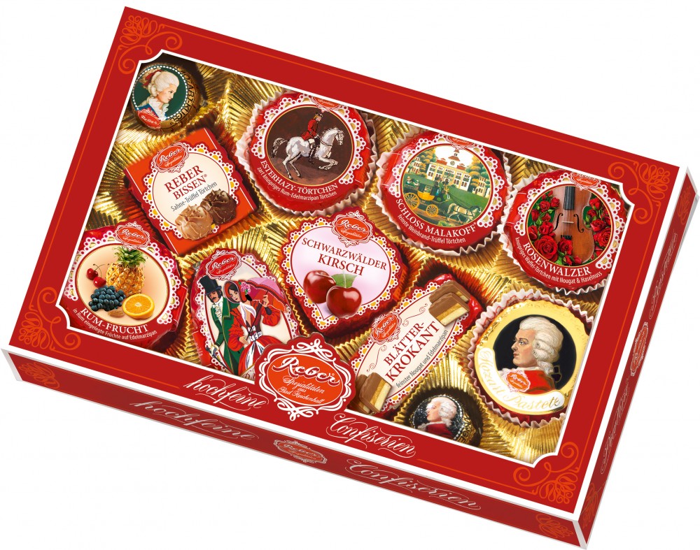 Összetevők: cukor, mandula, kakaóvaj, kakaómassza, mogyoró, teljes tejpor, mazsola, brandy, cseresznye, laktóz (tej), tejszín (30% zsír) (tej), búzaliszt, vaj (tej), tojáslikőr, invertcukor szirup, glükóz szirup, ananász darabok, kandírozott narancshéj, méz, nedvesítőszer: invertáz, glycerol; tiszta vajzsír (tej), rum, pisztácia, alkohol, emulgeálószer: lecitinek; Morello cseresznye püré, meggy, tojássárgája por, természetes aroma: cseresznye, narancs, rum, szőlő, vanília, savanyúságot szabályozó anyag: citromsav, nátrium-citrát; tojásfehérje, Grand Marnier, citromlé koncentrátum, só, búzakeményítő, tejszínpor (tej), árpamaláta kivonat (búza), karamellcukor szirup, zselésítőszer: pektin; térfogatnövelő szer: nátriumkarbonátok. Nyomokban szóját tartalmazhat. Kakaó szárazanyag tartalom az étcsokoládéban min. 60%, a tejcsokoládéban min. 35%.